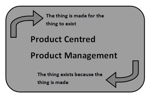 Sticker with Product Centred Product Management at the centre. The ideas of things existing because they can be made around top and bottom
