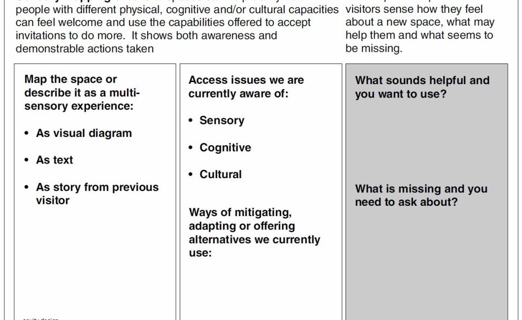 three column diagram of mapping space as it currently exists, what is known to be problematic and solutions offered and then what can potential vistors appreciate or gaps they need to ask about.