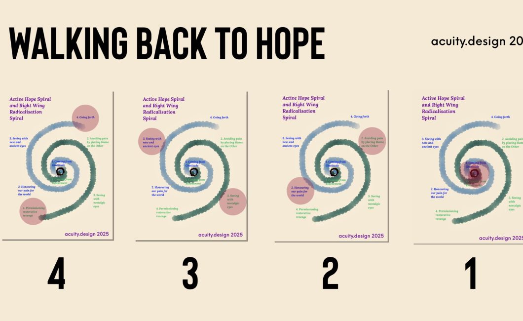 That the Active Hope spiral resembles the Right Wing Radicalisation spiral is, ironically, proof that it is a useful narrative model for now. The Right are succeeding with their short, emotional stories of immigration and lost communities. If there is an alternative path that leads to hope not hate then that is good.